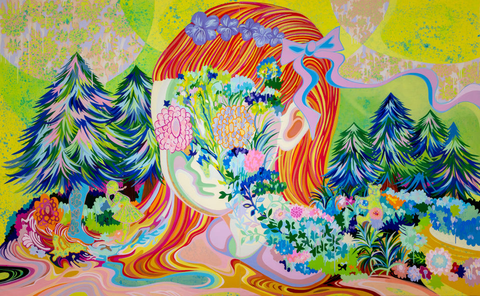 In Nanako Kawaguchi’s paintings, the figure of the girl emerges not as a solitary subject but as a shifting presence that overlaps with the forest itself. Flowers and trees sprout from her face, her body merges with the landscape, and in this act of mimicry she becomes both human and nature. The image holds within it the playful structures of “hide and seek” and “camouflage,” where concealment and revelation intertwine.